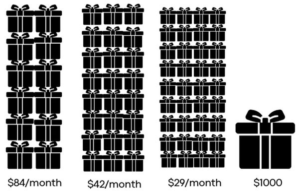 Think of $1000 like a box. That means we have to fill 185 boxes. If you are feeling led to fill one of these boxes there are 4 ways to fill a box: